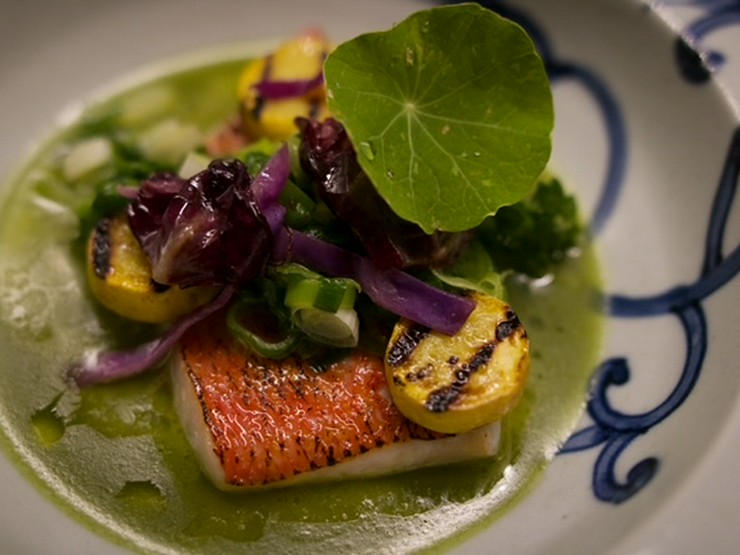 キンメ(当日仕入れた旬の魚)をふっくらと火入れし魚の出汁とフランスのボルティエバターのソース。仕上げに香ばしいわけぎオイルとイタリア野菜で。