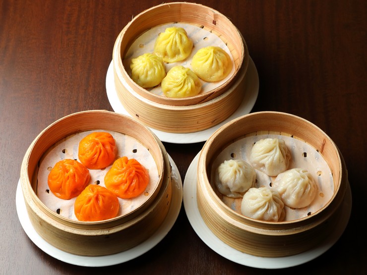 個性豊かな『特製上海小籠包(写真右下)/麻辣山椒小籠包(写真上)/上海蟹味噌小籠包(写真左下)』