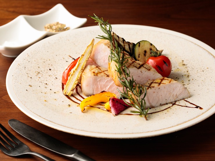 宮城県蔵王産の豚肉「JAPAN X」の厚切りロースを、65℃の低温でゆっくりと火入れし、サーブ直前にグリル。バルサミコソースを敷いたお皿に旬のグリル野菜を添え、フランス産の粒マスタードと塩でいただきます。