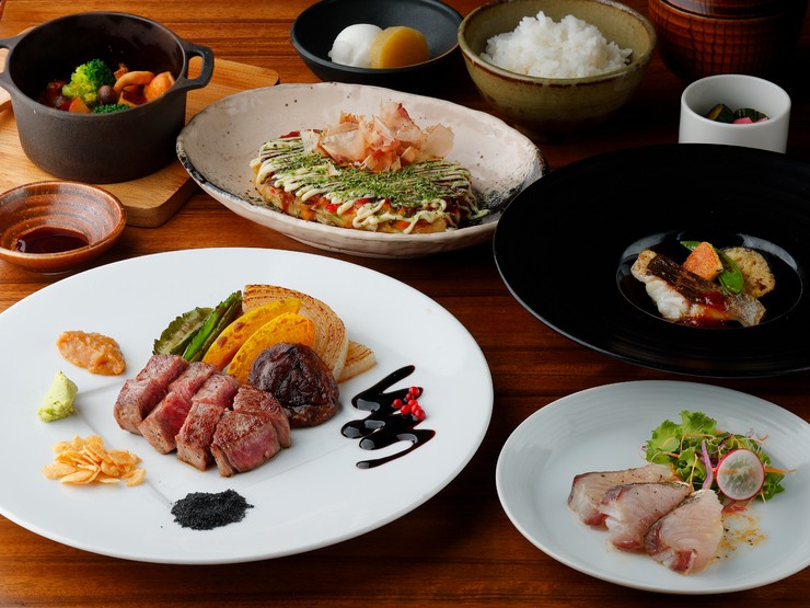 神戸ビーフや黒毛和牛A4ランクのステーキと大阪名物お好み焼きなどの鉄板焼きが楽しめる【大坂鉄板焼 鉄十】。「気軽においしいものをちょっとずつ」というコンセプトのもと、銀座にありながらリーズナブルな価格でランチやディナーを味わうことができます。コース料理は、肉の部位、食べられる量などを選ぶことが可能。ランチ、ディナーともに、毎月旬の食材を使用したコース内容です。ソムリエが選ぶワインも魅力の一つ。料理に合うことはもちろん、手頃な値段のワインがラインナップされています。ジャズが流れるシックな雰囲気の店内から望む銀座の街並み。夜には夜景も楽しむことができ、昼と夜で違う顔を見せてくれるレストランです。