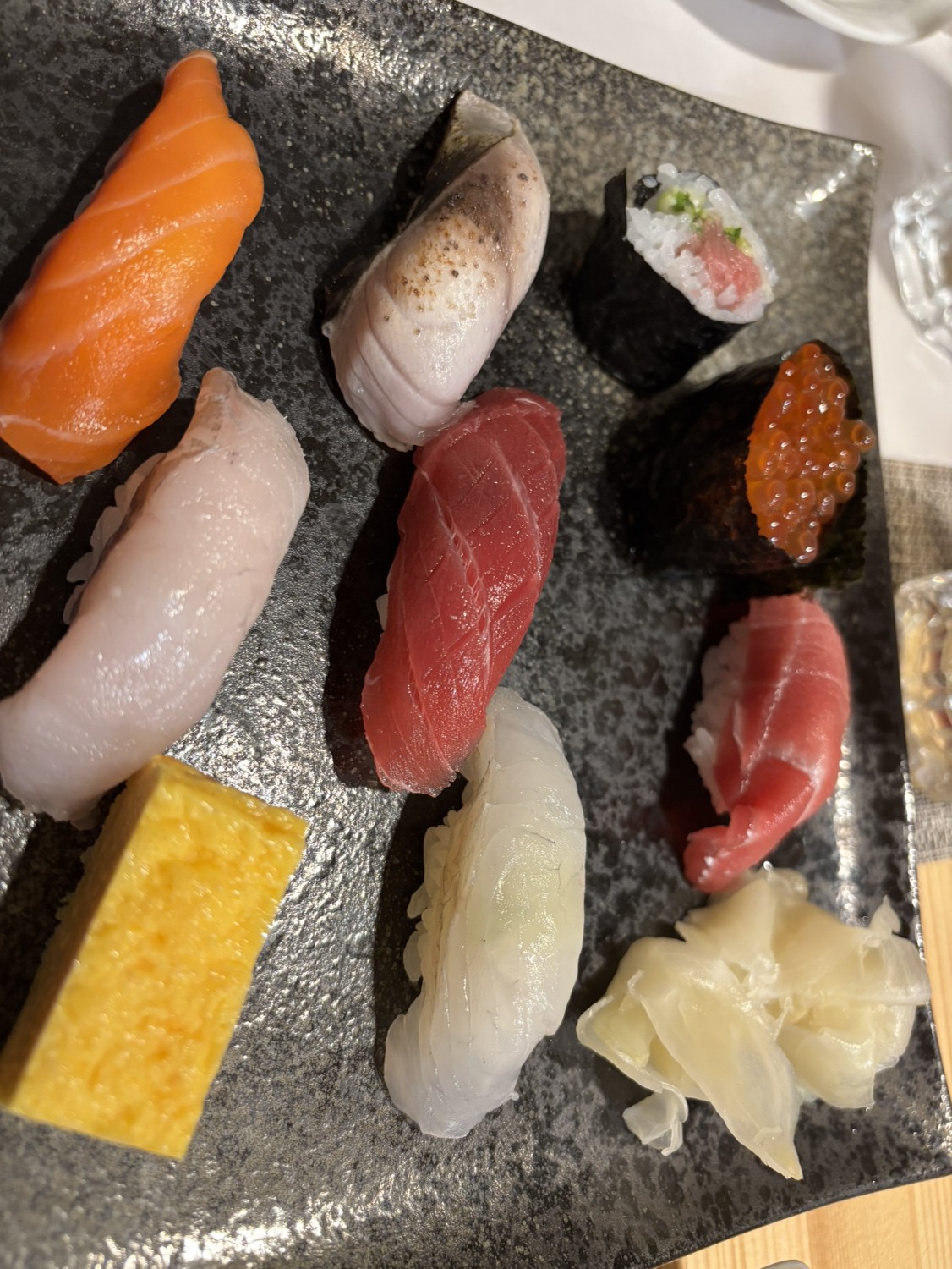 銀さば、マグロ、どんこの肝のせ、イクラ、ヒラメなど、仕入れ状況によって内容は変わります。『特上』にはその日選りすぐりの贅沢なネタ、旬のネタが盛り込まれて豪華です。