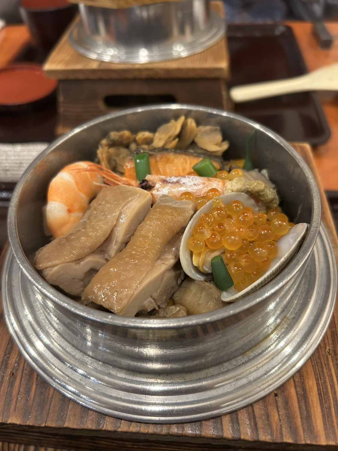 選べる釜めしに、お造り、茶わん蒸し、煮物、大えびの天ぷら、味噌椀、お漬物、デザート、ソフトドリンクのセット。懐石コース並みの贅沢さと品数で、満足感もひとしおです。尚3名様以上はご予約とさせて頂きます。