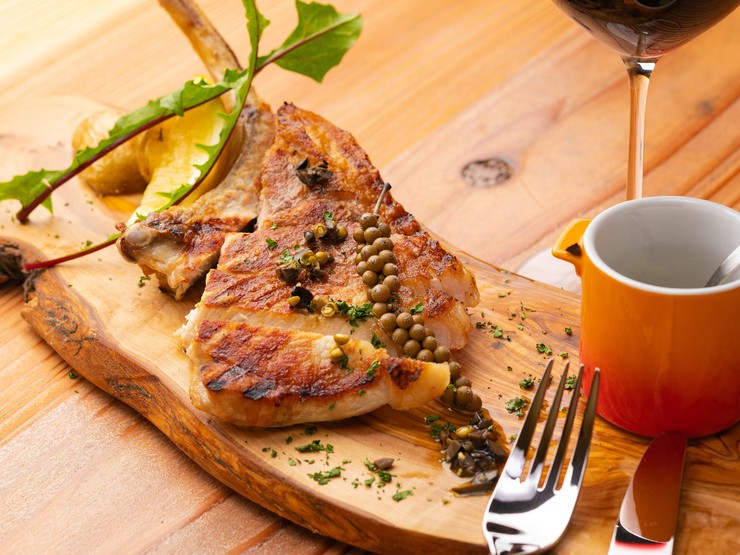 贅沢なおいしさを満喫できる『糸島豚骨付きロース肉のグリル 生胡椒のソース』