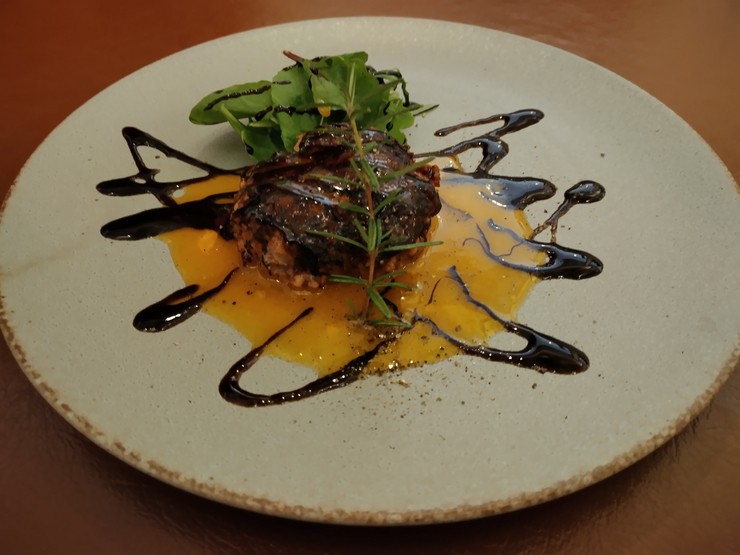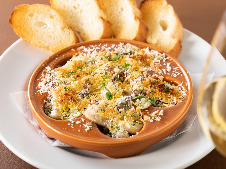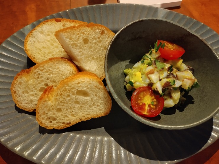 軽く火を入れた地ダコとキノコにガーリックバターをのせてパン粉焼きにした逸品。バケットにのせて食べるのがオススメです。きのこと、店名の「キノ」をかけた、キノの定番前菜。
