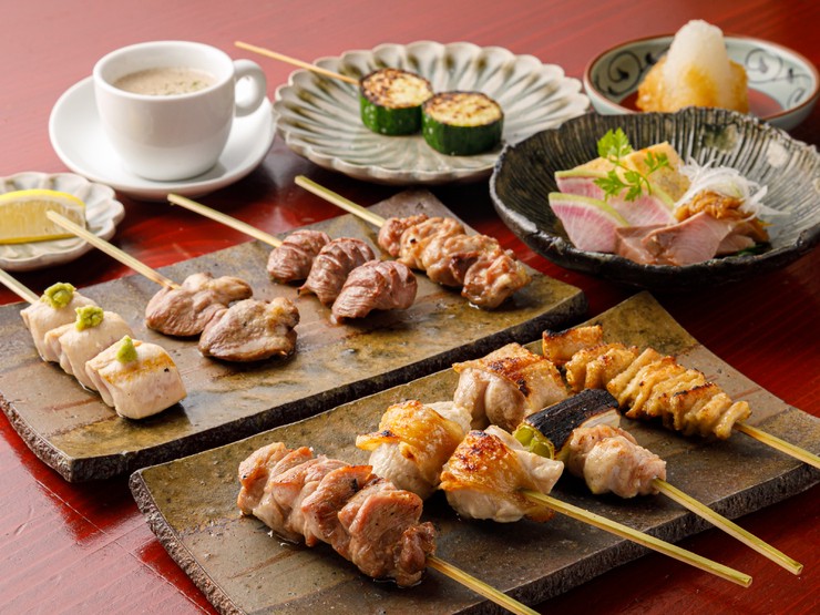 「高坂鶏」各部位の特色を活かして串打ち・味付・焼きを施した串各種。むね肉に鳥皮を巻き香ばしく焼いた「だきみ」などで一星だけの味に出合えます。コースで堪能する他、アラカルトで追加注文も可能です。