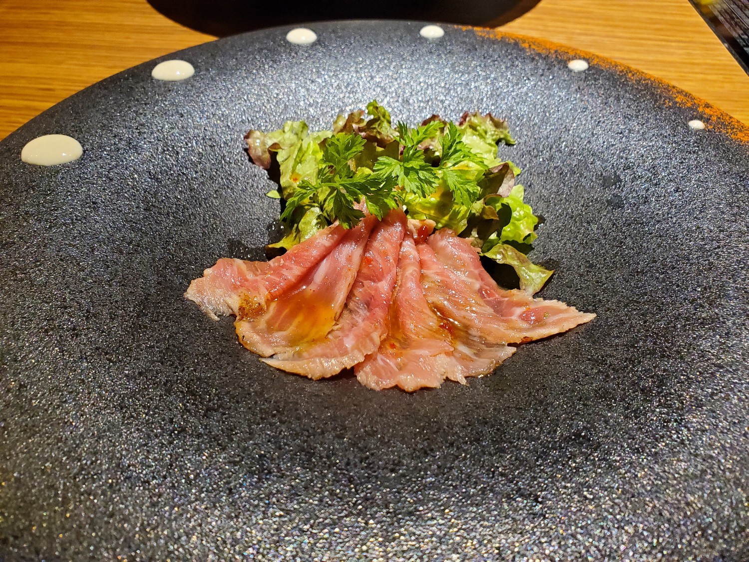 お客様の目の前で、繊維に沿って一枚一枚、丁寧に手切りいたします。機械でスライスしたものとは食感と味わい、風味が全く違います。