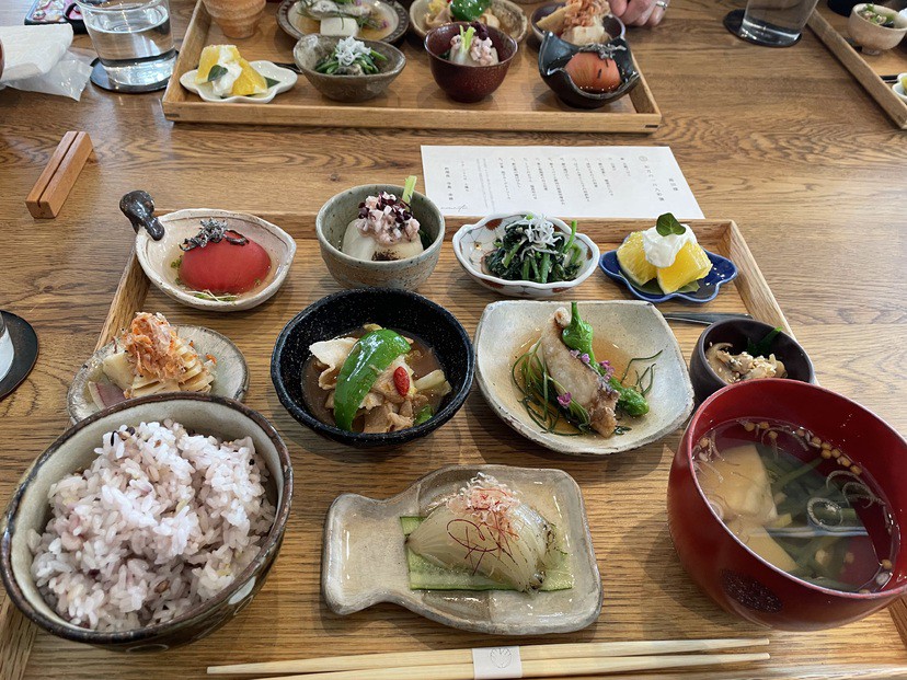 旬の食材をたっぷり使った日替わりおかず9種に、季節の雑穀をブレンドしたごはんとこだわりだしの味噌汁がついたお膳です。一品ずつの盛り付けで、一皿ごとのおいしさを味わえます。美しい彩りも楽しんで。