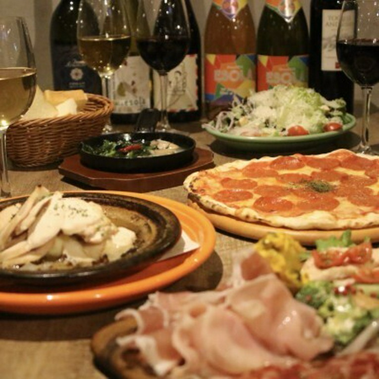 時間無制限ワイン飲み放題(金土祝前2時間制)自家製生地のピザを窯焼きでご提供!ハーフ&ハーフやテイクアウトできます。三密回避のため大人気の個室(最大6名様)ご用意ございます。ご予約はお早めに!
