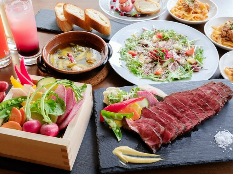 国産A5ランク和牛かたまり肉、肉串、ソーセージなどの肉料理が自慢の肉バルダイニングです。田原町駅より徒歩2分。お仲間との集まりなどに時間を気にせず愉しめます。野菜や海鮮にもこだわり、豊富なメニューを取り揃えております。ゆったり広めなお席でおくつろぎいただけます。