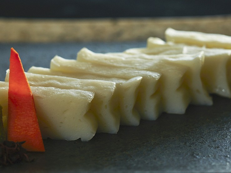 小田原の老舗店(山上蒲鉾店)と当店のオリジナル商品。水分量などの微妙な調整により蒲鉾が刺身のを彷彿とさせる食感に。お持ち帰りも多く求められる“とりあえず”頼む逸品。