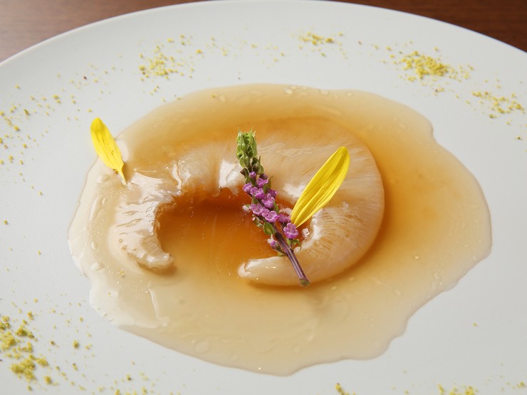 気仙沼産ヨシキリザメのフカヒレを使用。ほかの料理との味のバランスを考えたソースで、訪れるたびに違う味わいを堪能できます。写真は『気仙沼産 吉切鮫 フカヒレの姿煮』。独特のプリプリ食感がたまりません。