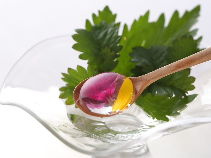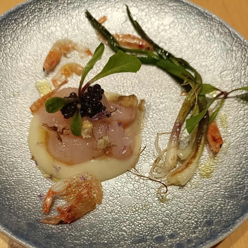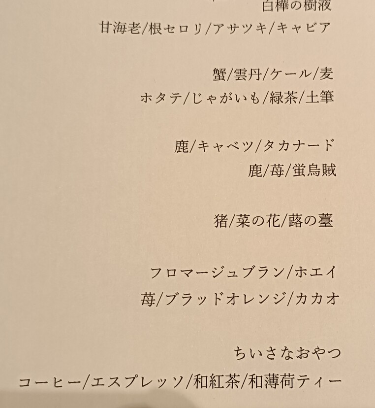 木の葉の上を転がる朝露を思わせる一品は、白樺の樹液を花びらと共に冷やし固めたもの。器のきらめきや木の香りと相まって、都会の喧騒から一気に森の中に入った感覚に。