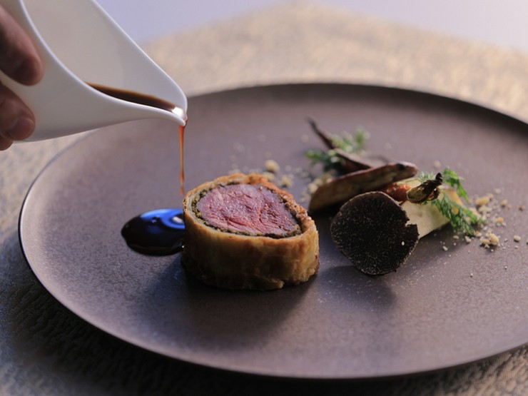 ホテルオークラ東京【ラ・ベル・エポック】のスペシャリテを京都風にアレンジ。4日間かけて煮だしたフォンドボーをベースにしたソースに、京都の味噌を隠し味に加えた京都の食の魅力が光る一皿です。