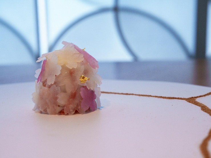 桜をイメージした県産鮮魚の瞬間スモークとカブのババロワ