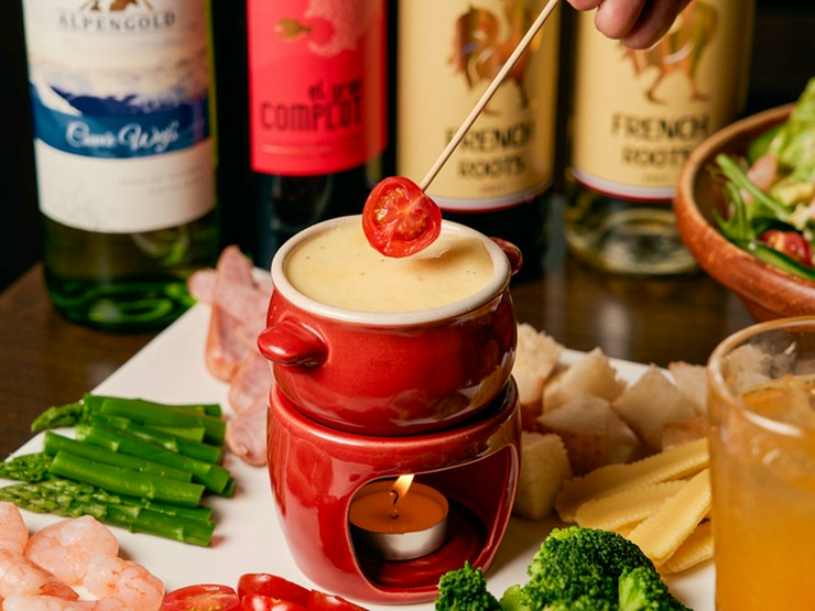 とろとろに溶けたチーズに新鮮な野菜やバゲットをディップして楽しむ、贅沢なチーズフォンデュセット。
