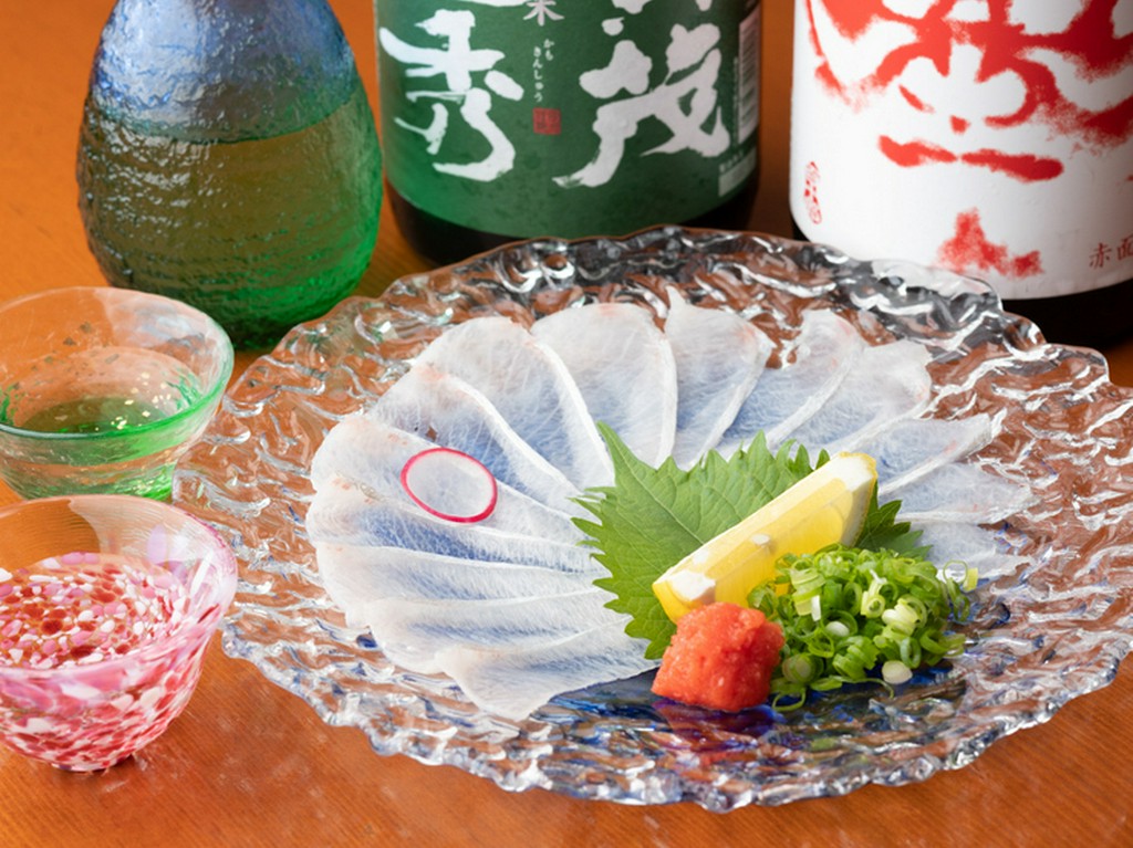 魚の部位を活かす調理は、魚を知り尽くした店主ならでは。脂が乗ったかんぱちのズリ(腹身の下部分)は薄づくりにして、素材本来の味と食感を堪能できる一皿に。優しい酸味の自家製ポン酢との相性が絶妙。夏季の例。