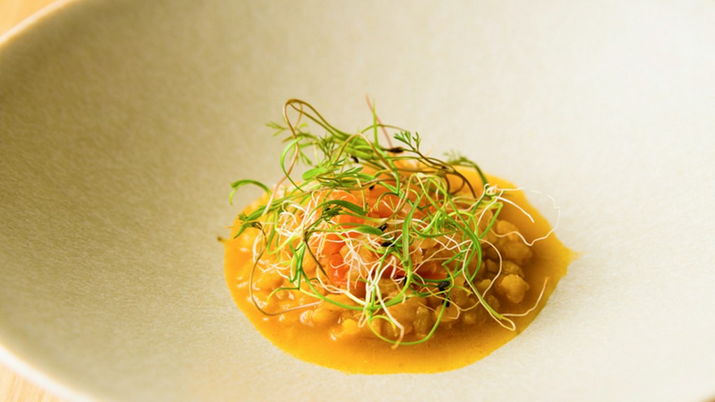 東北の食材×モダンバスクの技と趣向を楽しめる皿。バスク伝統のソースで調味したズワイガニを白菜などで包み、オーブンで焼き上げ。赤ピーマンのソースと合わせ、重層的でドラマチックなおいしさに。前菜の一例。