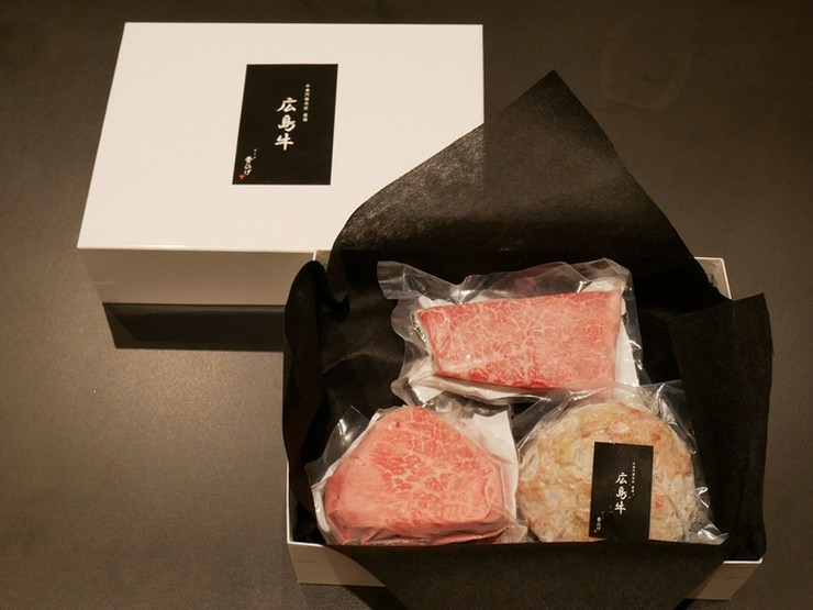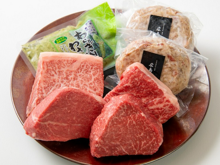 A4等級のステーキの王道、ヒレとサーロイン、そして青ひげのおすすめのランプとイチボの4種類のステーキをそれぞれ約150gずつ、さらには広島牛100%ハンバーグと広島の吉和産わさびを詰め込んだ青ひげが誇る贅沢なギフトです。