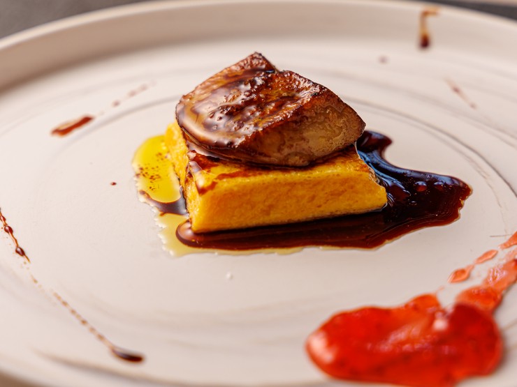 香ばしく焼き目をつけたフォアグラを、フレンチトーストの上に乗せて提供する逸品。赤ワインソースとアクセントを与えるイチゴのソースが、フォアグラの濃密な味わいを引き立ててくれます。