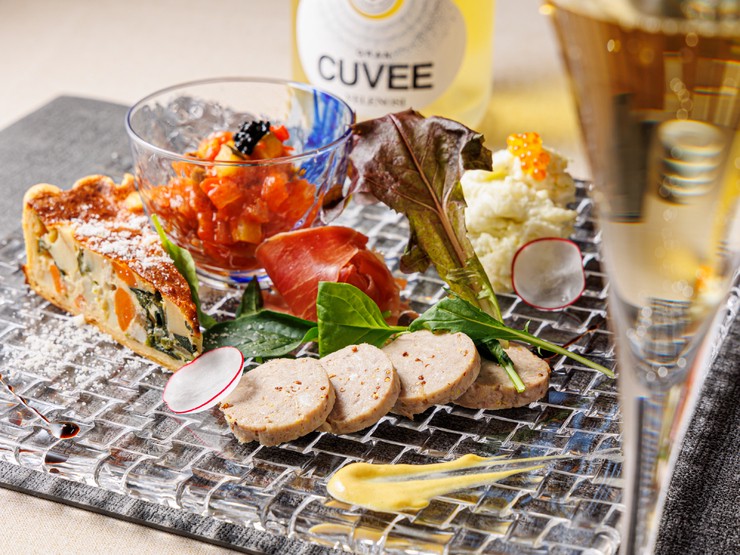 色とりどりの前菜は、ワインのアテや最初の一品としてオススメ。季節の野菜を取り入れたキッシュに、【Um azura】ならではのわさび風味のポテトサラダと、こだわりが詰め込まれています。