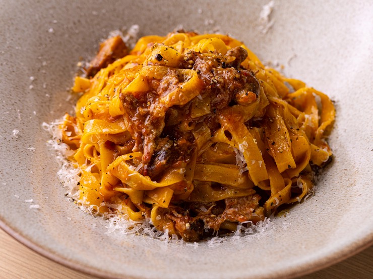ドイツで感動したタリアテッレ。パスタマシンを購入し、毎日のように自宅で再現を試みました。配合を改良しオリジナルパスタに。塊肉と2種のワインのラグーソースはオーブンでじっくり煮込んだ濃厚な仕上がりです。