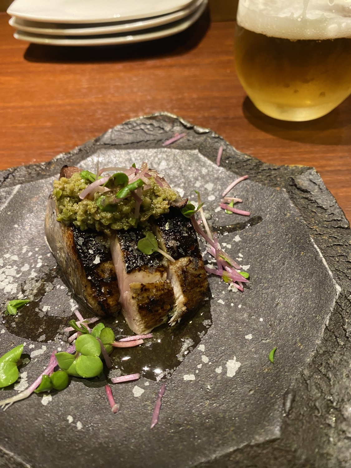 熊本県が誇るブランド食材「あか牛」を使用した、牛の薪焼き。きめ細かな霜降りのミスジや、赤身肉など、当日のオススメ部位を豊かな風味に包み届けてくれます。