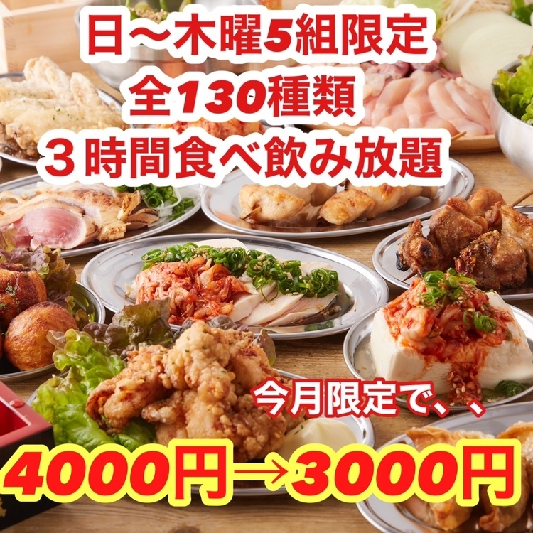 【3時間 130種類食べ飲み放題4000円⇒3000円◇】餃子こぼれ麻婆鉄板焼鳥◇日~木限定☆歓送迎会