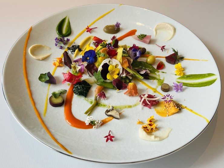 コース前半の山場は、九州の大地の恵みで彩る温前菜。多彩な季節野菜やハーブ類、佐賀産生ハムなどを皿に絵を描くように盛合せ。自然の黄金比に基づく組み合わせ、美しさ、味わいに心を奪われる逸品!写真は一例。