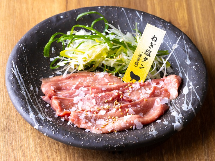 羊のタンは牛タンよりも小さく、一人前に1本使用されています。タン元を手切りで薄くスライスし、ねぎと一緒に巻いてどうぞ。独特のくせがない淡雪塩が、素材の旨みを引き立てます。