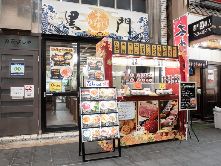 黒門市場の新鮮な海の幸を堪能できる【黒門 蔵銀】。握り寿司や海鮮丼など、新鮮な魚介をリーズナブルに提供しています。イチオシメニューは、新鮮な生本鮪のトロと赤身を贅沢に盛り合わせた『鮪二種丼』です。肉厚なアトランティックサーモンと北海道産イクラを使った『サーモンイクラ丼』も好評。さらに、11時から利用できるテイクアウトも人気です。お酒のバリエーションも多く、特にプレミアムな日本酒はオススメです。店内には38席のテーブル席があり、団体でも利用可能。もちろん、一人でもおいしいひと時を満喫できます。大阪の中心地なんばエリア(日本橋)にあり観光にも便利。外国の方にもうれしい多言語メニューも用意されています。