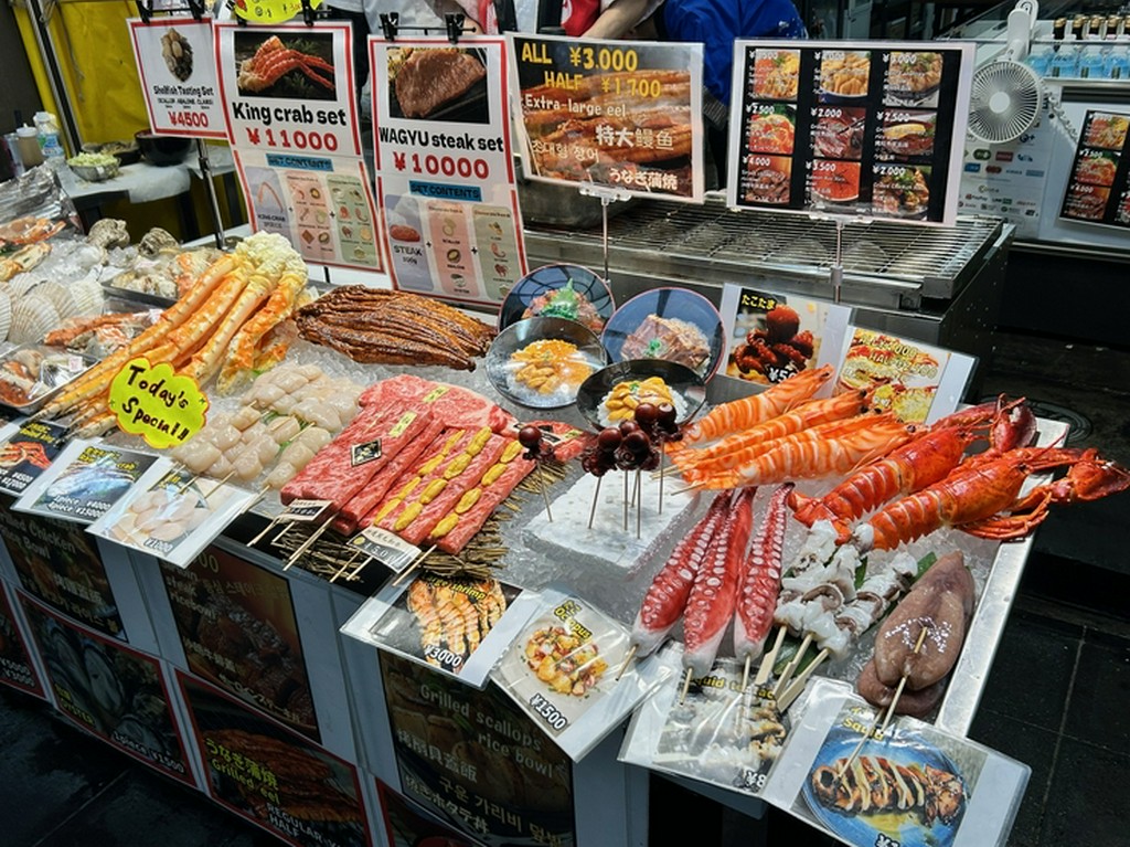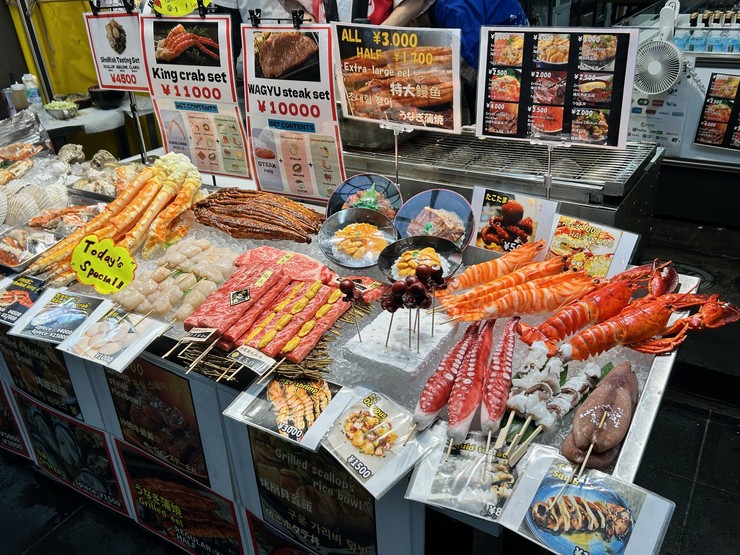 “大阪の台所”こと、黒門市場の一角にある【黒門とれぴち市場 南黒門店】は、とれたて海産物を気軽に楽しめる穴場的スポット。サイズ感にもこだわったタラバガニや海老などの海産物を、シンプルに楽しむ海鮮焼きは食べ応え抜群。旬の魚介をシンプルに味わう串焼きや、ボリューム感ありの丼もの、季節のフルーツを使ったデザート&ドリンク、仕入れによっては「神戸牛」などの厳選和牛を使った鉄板焼き・肉寿司も楽しめます。アルコールも豊富で、お一人様や友人との食事に最適。店内は2フロアで構成された賑やかな空間で、家族との楽しい一時にもぴったりなお店です。店舗1階では販売もあり、食べ歩きでの立ち寄りもオススメです。