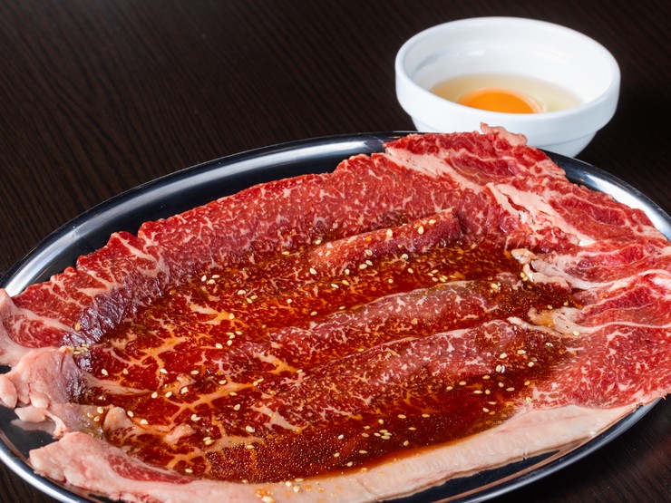 タレのかかった薄切り上ロース肉に、生卵がセットになったメニュー。片面5秒・裏面3秒と火を通したあと、すき焼き感覚で玉子につけていただく逸品。こだわりのスタイルが、お肉をさらに魅力的にしてくれます。
