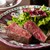 インパクト抜群のビッグサイズの豚ハツ。両面焼きめを付けた後は、ハサミでカット、香草バジルバターにディップして賞味あれ。お肉の味付けはシンプルな塩を採用。風味豊かなソースと絶妙にマッチしています。