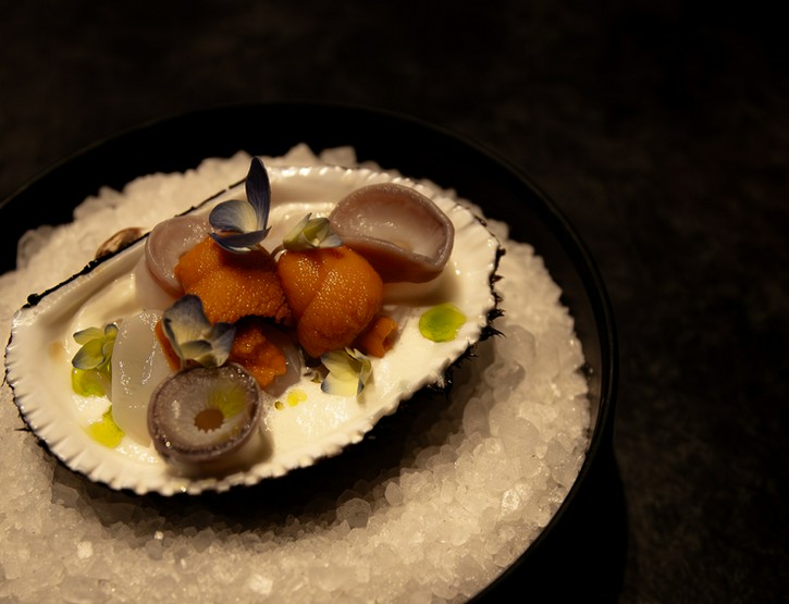 仙台市春日町、勾当台公園駅から歩いて数分のビルに入る【Nero】。ディナータイムに楽しめるのは、要予約の『おまかせコース』。本場・イタリアで腕を磨いたシェフが生み出す、趣向を凝らした料理を堪能できます。カウンターに腰を下ろせば、目の前の鉄板で繰り広げられる調理風景を間近に見られ、特別な時間を過ごせそう。イタリア語で黒(Nero)を意味する店名どおり、店内はシックで落ち着きのある雰囲気。大切なパートナーと訪れるのにぴったりなお店です。