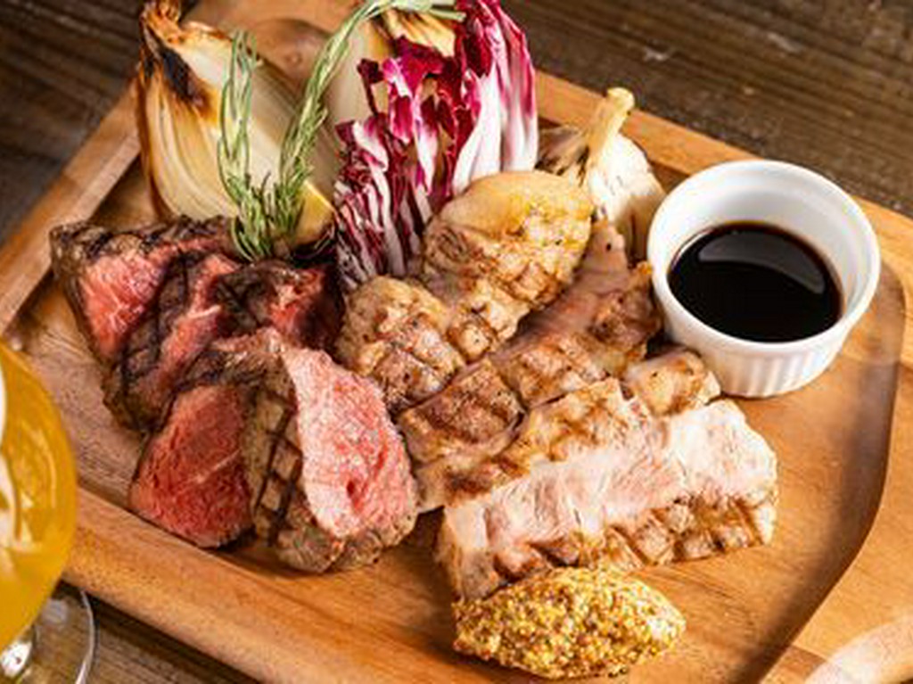 お食事は岩手県花巻市直送『白金豚』のステーキをメインに『トリュフサラダ』『うにバターリゾット』等人気メニューが盛り合わせになったお得なコース。+700円でベルギークラフトビール4種類も追加で飲み放題可能。