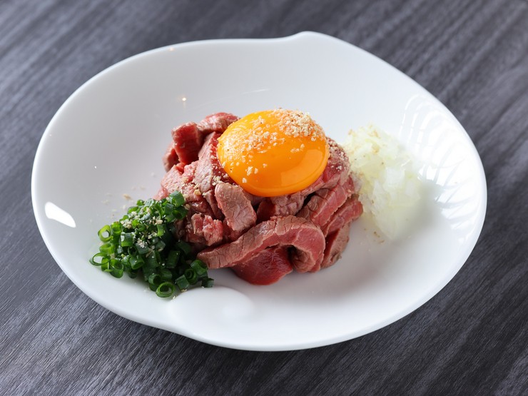 そのまま焼肉としても提供できるロース(内モモ肉)に一手間。一味違ったおいしさを届けるローストビーフ。ユッケを思わせる盛り付けも印象的な逸品です。