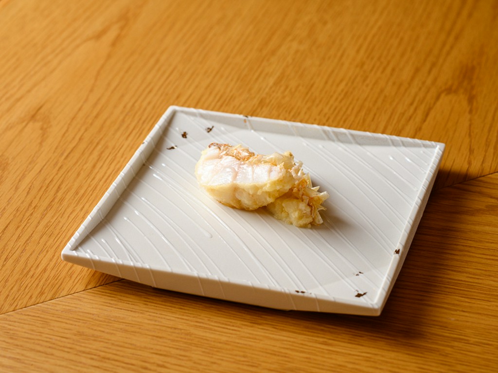 会席料理の腕も磨いた店主が繰り出す新趣向の天ぷらも評判。海老のすり身をパンにのせて揚げたこの品は、海老真薯のふわっと優しい風味とクリスピーな食感が絶妙にマッチ!おまかせコースなどで登場。