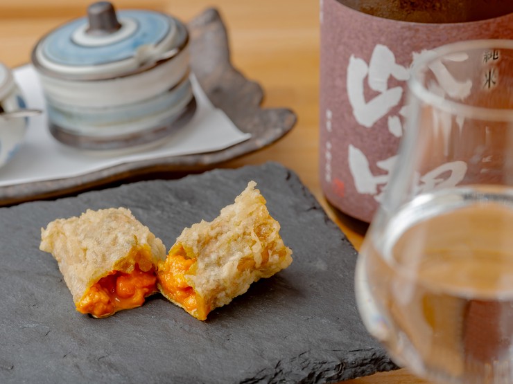深みのある塩味をまとったタラコの天ぷらはなにも付けずに。地酒やワインにもピッタリな一品。殻付きをさばいて揚げるホタテの天ぷらは、素材のうま味を最大限に引き出したミディアムレアな食感。