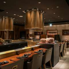 新鮮な魚介類や旬の野菜を薄めの衣でからりと揚げ、ホテル風にアレンジされた創作串揚げを味わえる【ウイスキー&ワイン「シュン」】。季節のおいしさを取り入れたアラカルトも揃っています。ペアリングにオススメなのが、ソムリエが選りすぐる約450種のワインです。圧巻のリストからシーンや好みに合わせた1本をセレクトしてくれます。和の心意気を取り入れたエントランスには、店名が書かれたオリジナルの暖簾がお出迎え。黒を基調とした「シック」かつ「モダン」な印象を与える落ち着いたスタイリッシュな雰囲気ながら、どこかホッとできる雰囲気も漂います。優雅で上質な店内の空間、ホスピタリティの高さも同店の魅力です。