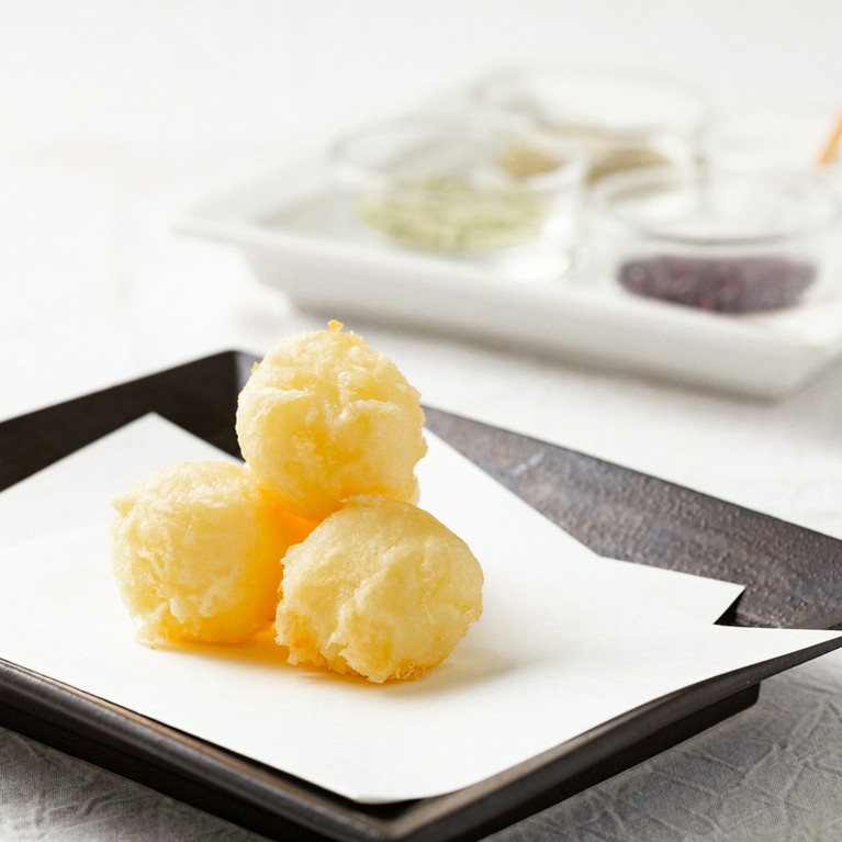 【つな八】オリジナルの看板料理。蛤を殻ごと揚げています。身を食した後は、殻の周りの衣を剥がして召し上がれ。蛤の旨みがたっぷり染み込んでいて、クセになるおいしさです。