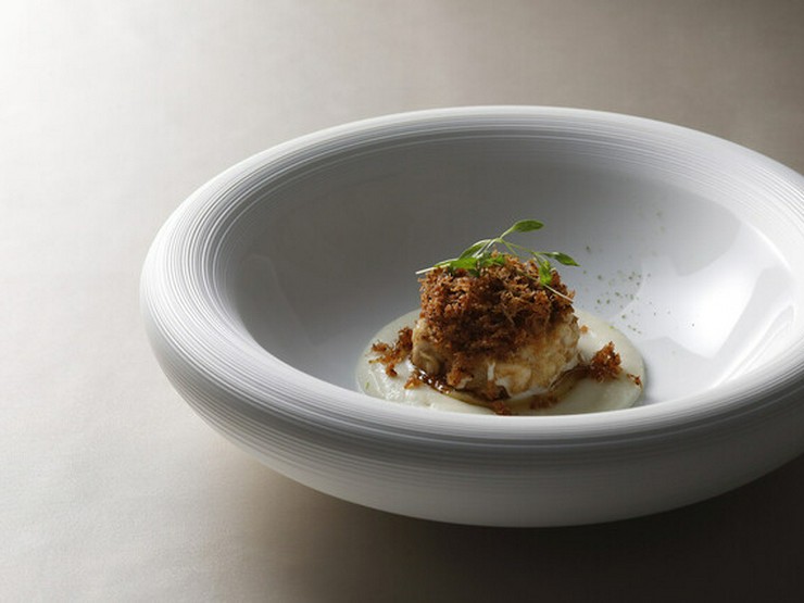 時期により鱧・白子・太刀魚など、旬の魚介に焦がしバターの芳醇な香りを纏わせた、橋本シェフのスペシャリテ。ブールノワゼットソースで仕上げたパン粉がサクサクと、心地良い食感を演出します。
