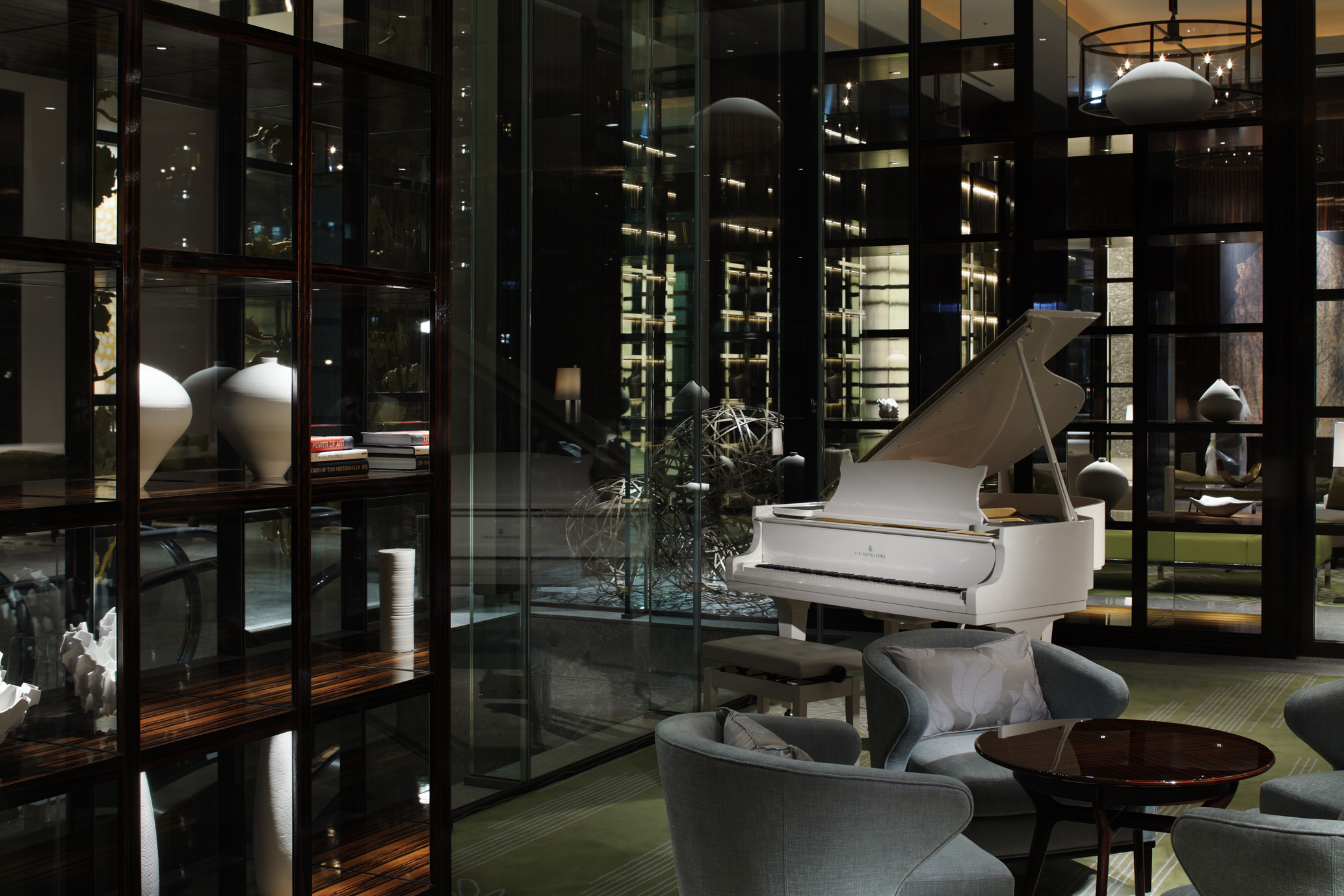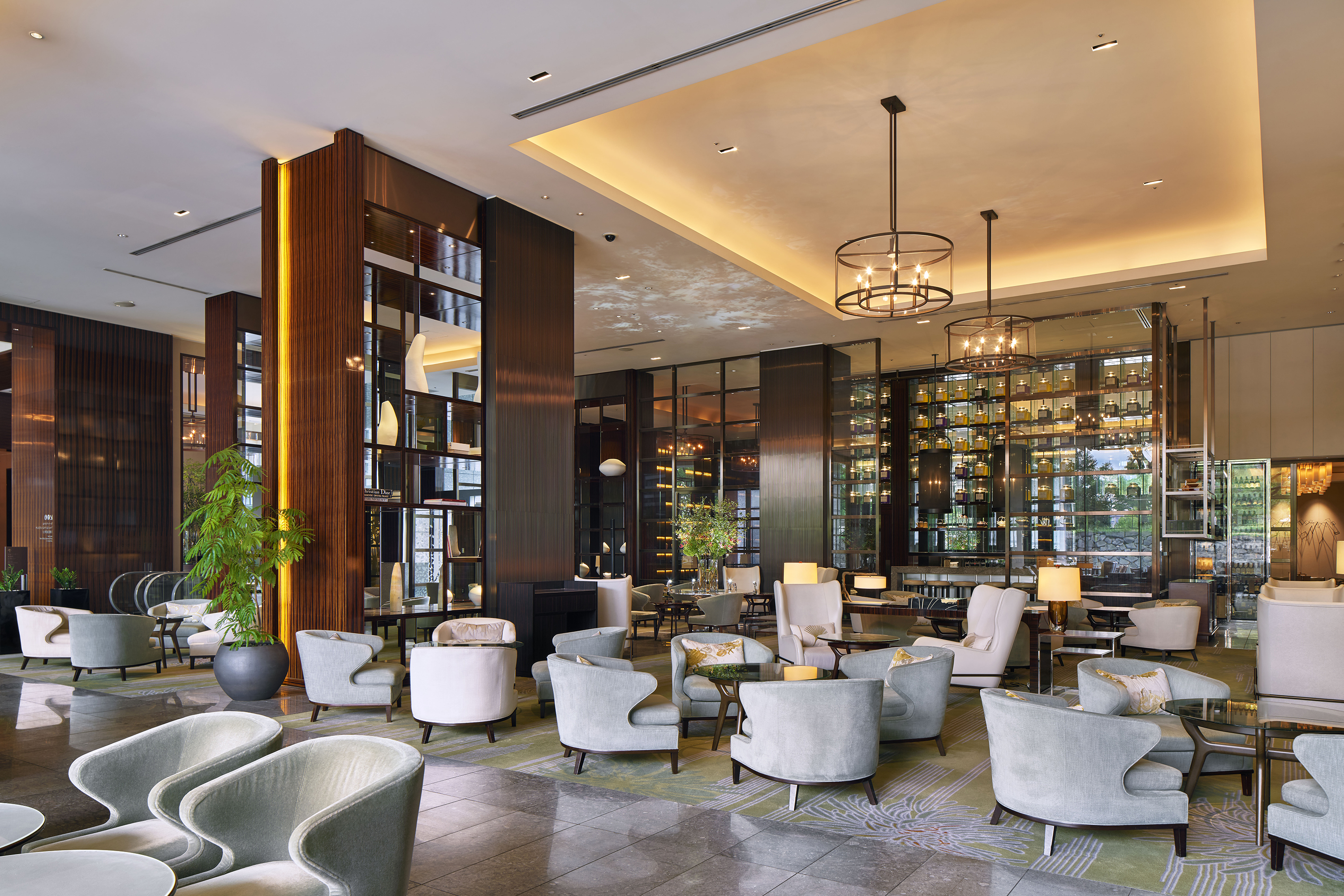 暖炉と本棚が、自宅のリビングのような寛ぎ感を醸し出すロビーラウンジ。窓外には緑やお濠の水が広がり、抜群の癒しの空間が広がっています。輪島塗漆器 "Stones" で提供されるアフタヌーンティーとともに楽しむ世界のお茶や、生演奏に浸りながらのバータイムなど、ホテルならではのエレガントなひとときをご堪能いただけます。