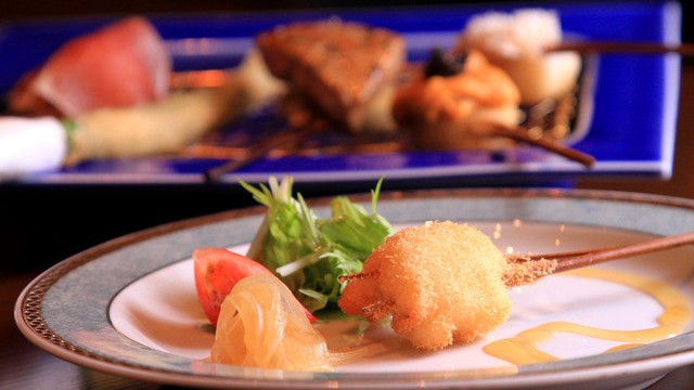 月明りのような柔らかい照明に照らされた店内は、落ち着きのある至福のひとときを演出します。店内はカウンターやテーブル席、完全個室を設置。ニーズやシチュエーションに合った席で極上の日本料理を楽しめます。職人の手捌きを見ながら食べる串かつは食材にもこだわりをもち、最上級の料理でおもてなし致します。串かつ、串揚げ以外にも寿司や天ぷら、季節に合わせたご飯などのメニューを有し、食事に合う銘酒も楽しめます。