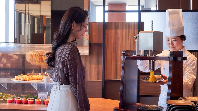 落ち着いた雰囲気のホテルレストラン「Sky Dining 天空」では、季節と時間の移ろいを感じる天空の船旅を提供します。ライブキッチンやフォトジェニックなジェラートが人気のブッフェ、アフタヌーンティーやコース料理などが特別な一日を彩ります。