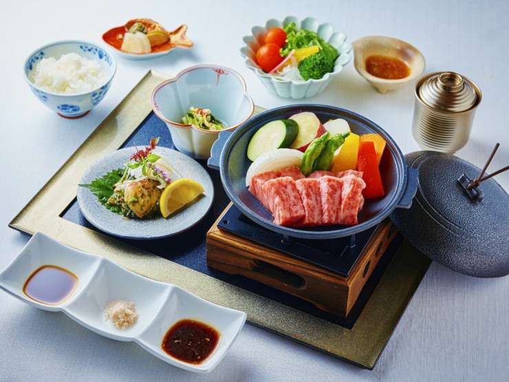 「淡路ビーフ」を中心とした地元の食材を、すき焼きスタイルで満喫。牛肉・フレッシュなトマト・玉葱と、さまざまな素材の旨味を、特製の割下が引き立ててくれます。