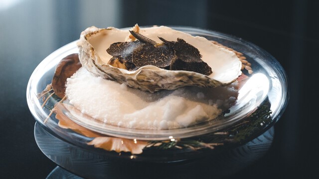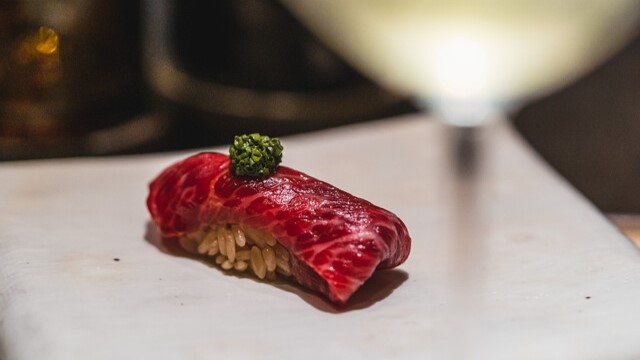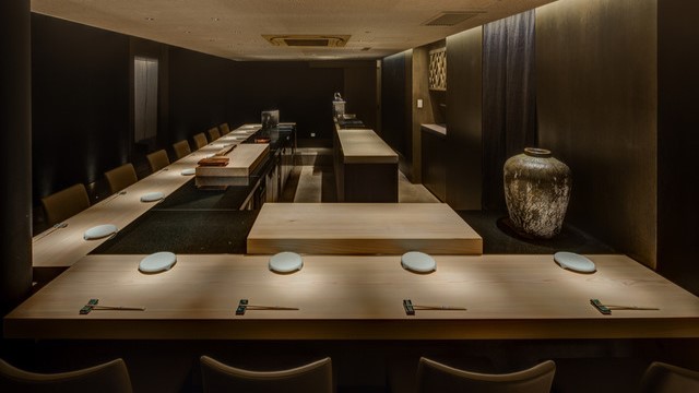 黒色を基調とした落ち着いた空間で、江戸前寿司とワインのマリアージュをお楽しみいただけます。日本中の生産者を訪ねて独自の仕入れルートを築きました。厳選して仕入れた食材の水分や脂の量、温度を調節し、素材の旨味を引き出します。選び抜いたワインや日本酒との相性をお楽しみください。カウンターには、伊勢神宮に奉納される予定だった樹齢200年以上の木曽ヒノキを使用。20時から店内を少しずつ暗くし、カウンターや板場を劇場のように演出しています。