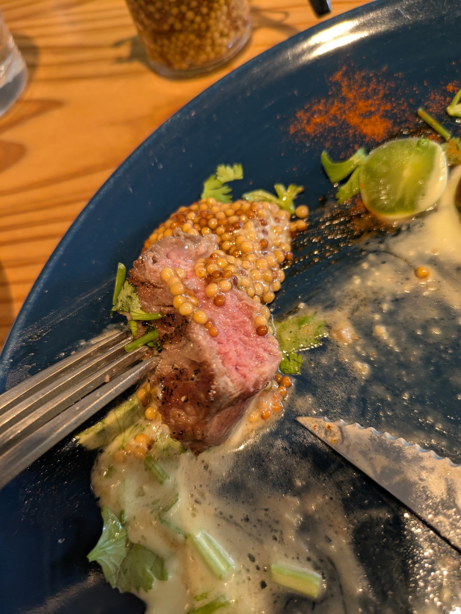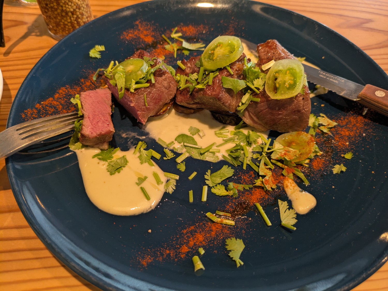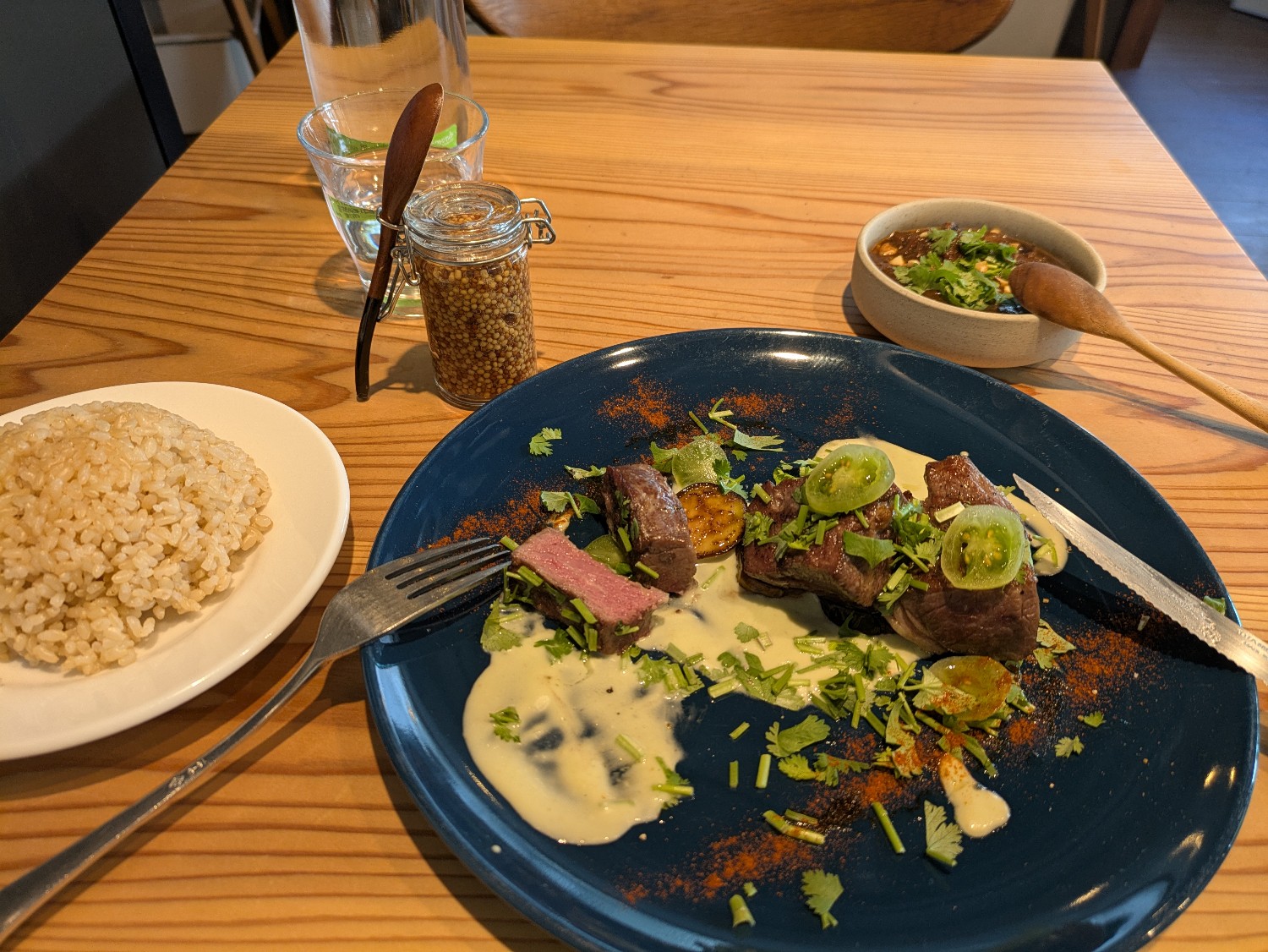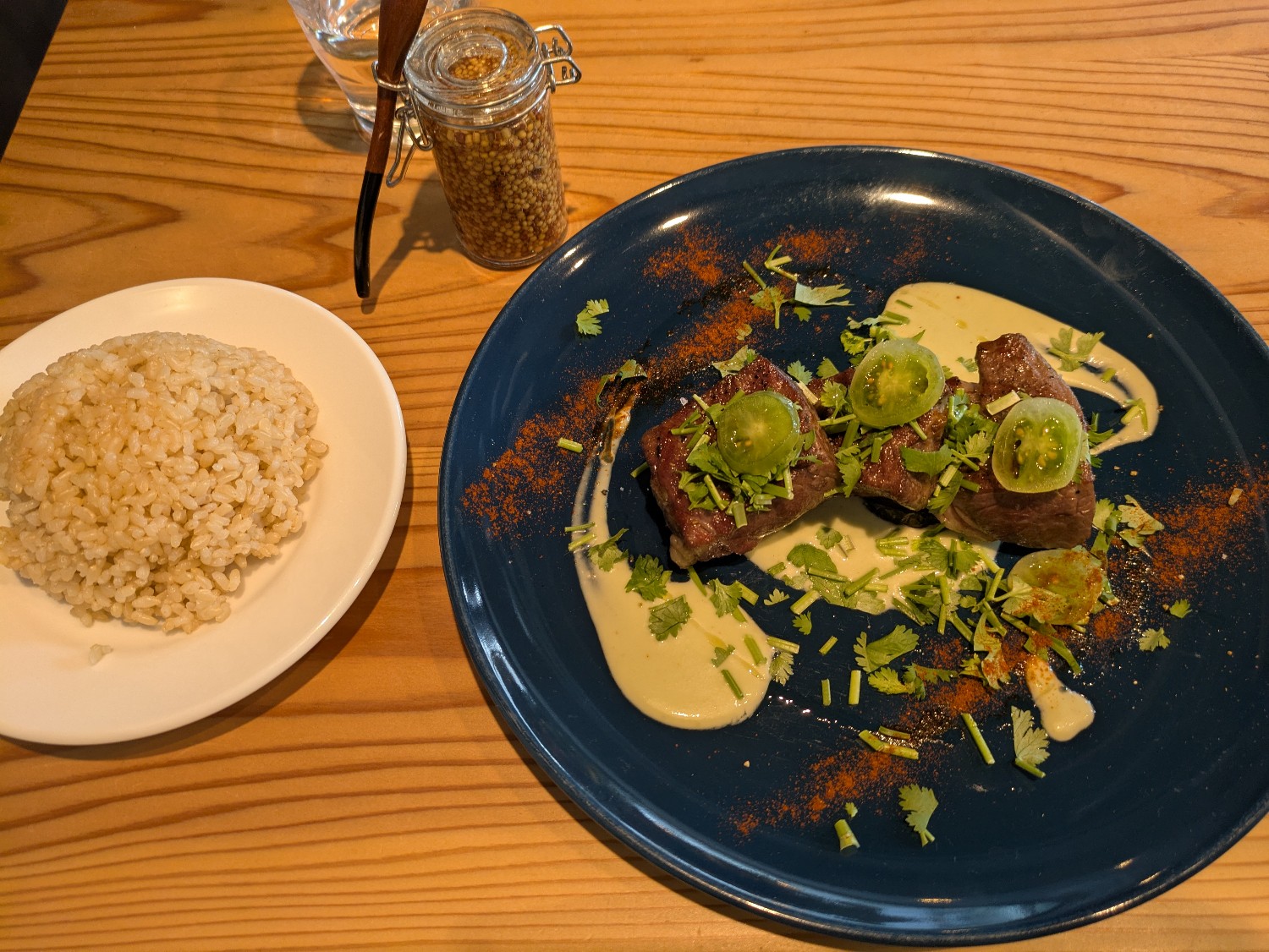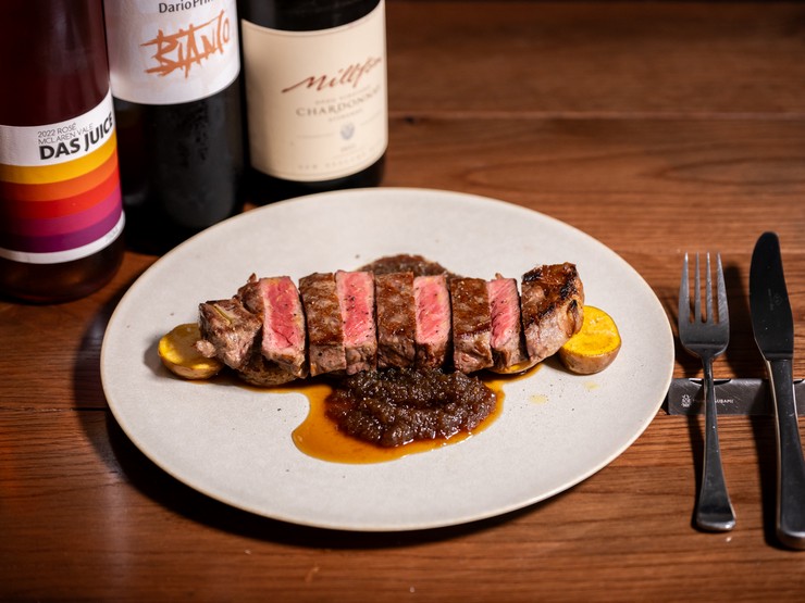 牧草だけで育てられた牛のサーロインを、肉中心の温度を53℃を保ちつつ焼き上げた逸品。火入れにこだわったお肉は、まずはそのまま一口。自家製オニオンソース・マスタードで変化を与えつつ楽しむのがオススメです。