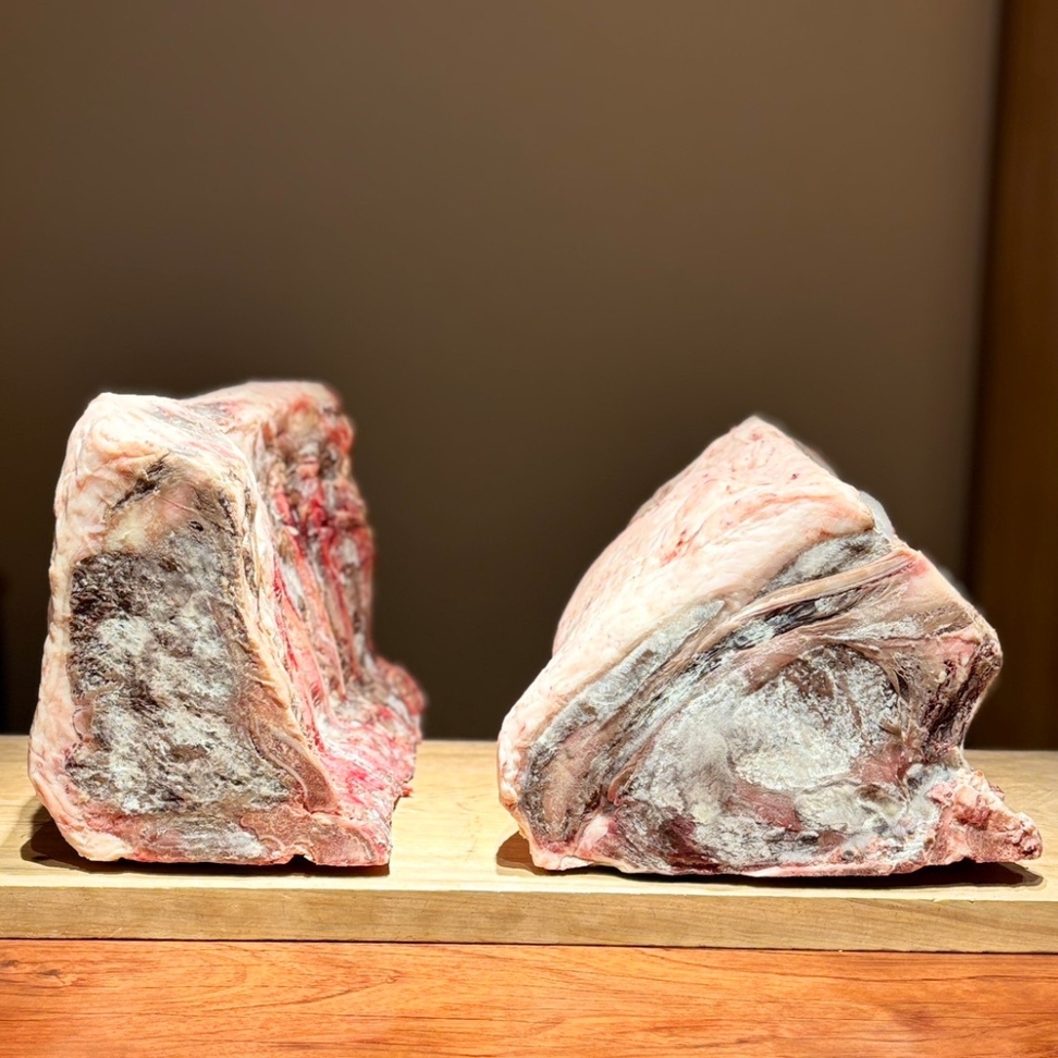 主人の岡義隆は、祇園で牛肉を焼く料理人です。肉焼きの仕事を続けて、20年以上。黒炭と薪を使い、遠火でゆっくりと火を入れる。脂が炭に落ち、炎が立ち上がる。その香りと煤が肉に絡み、香ばしさと奥行きが生まれる。お客様から「肉焼き師」と呼ばれています。ブビンガの一枚板、8席のカウンター。席からは、苔と玉砂利の坪庭が見える。炭火の音、肉の香り。目の前で、火が入っていく。歴史と自然の記憶から生まれた音色が、この空間に静かに重なり、料理は目の前で生まれる。