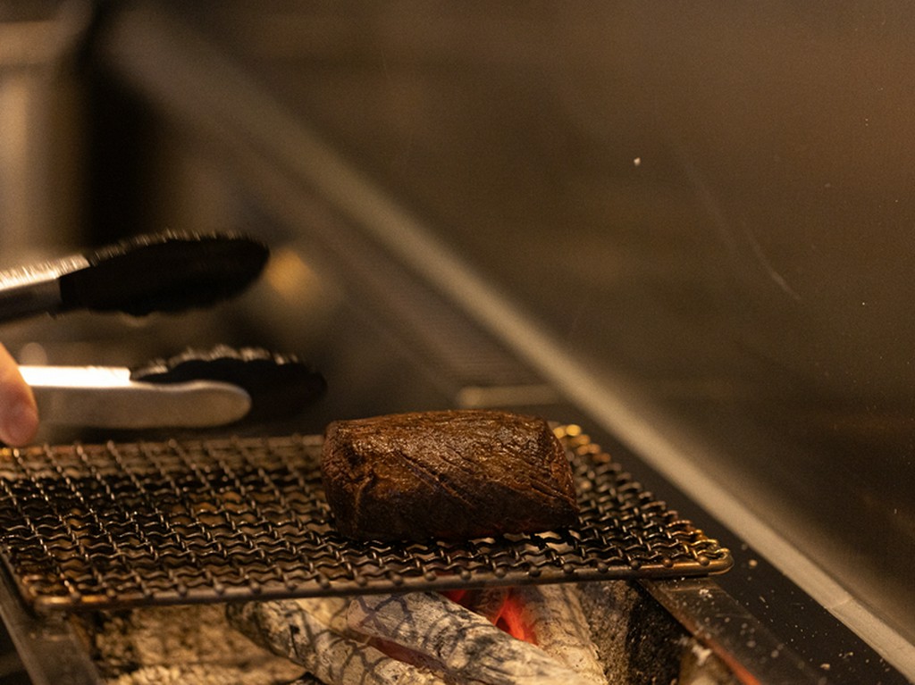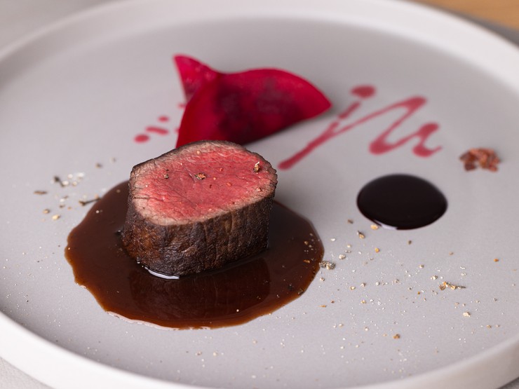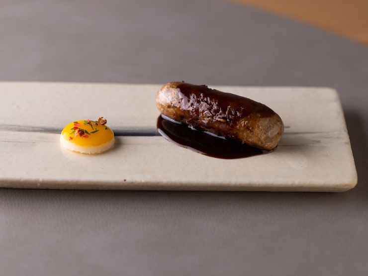 古くから付き合いのある北海道白糠の猟師、松野さんが捕る蝦夷鹿を使用。國長シェフ曰く「仕留め方やその後のケアがしっかりしているので常に最高の状態で届く」のが信頼の所以。最後に炭で炙り、香ばしく仕上げる。
