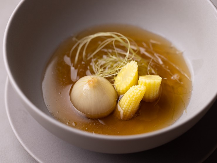産卵を終えた川俣シャモの母鶏を捌き、骨と筋を丸1日煮こんでベースのスープをとる。そこに挽肉状にした胸と腿肉を入れてスープを澄し、コンソメに仕立てる。これを旬の野菜を入れた器に注ぎ、香りも楽しませる。